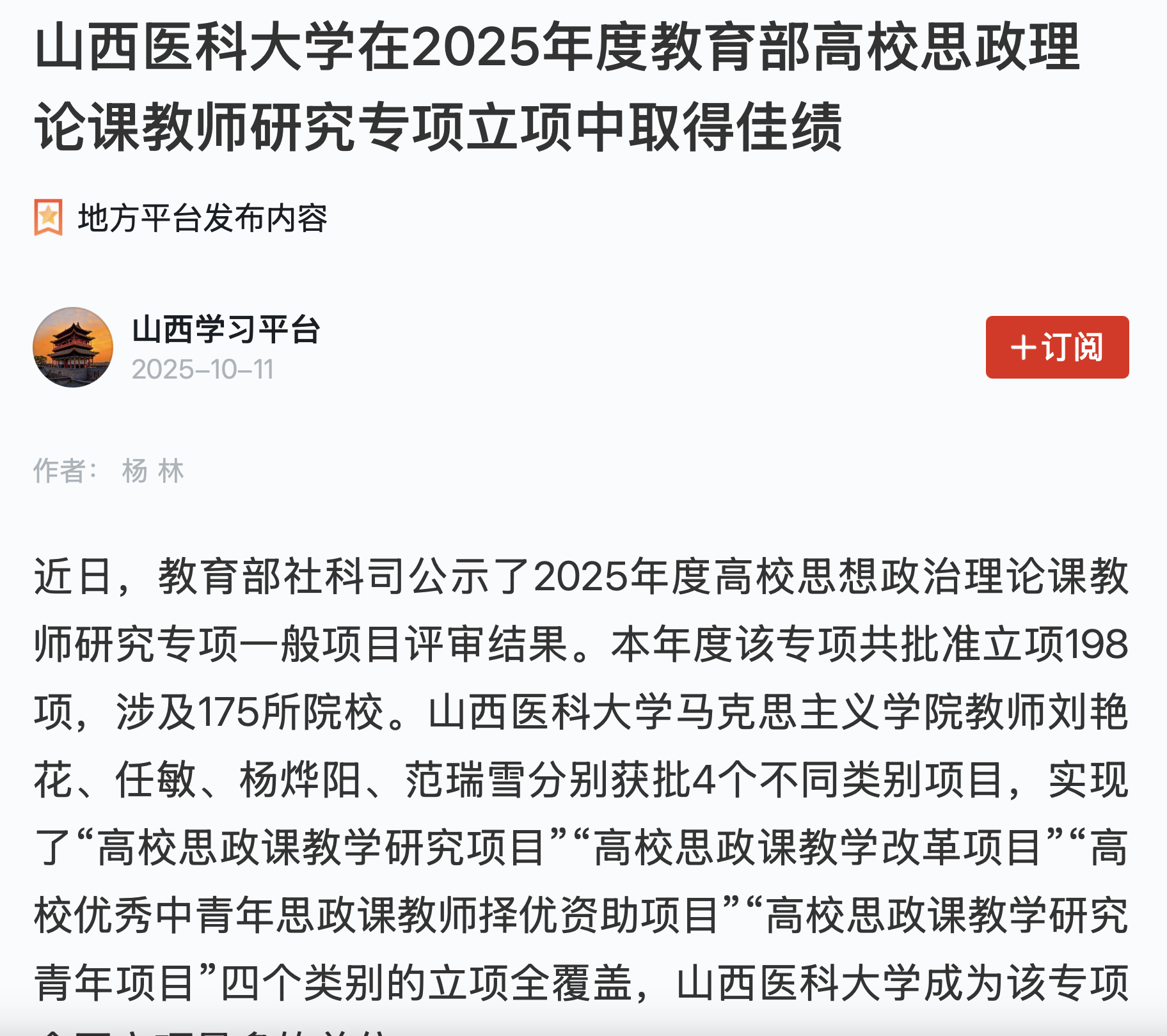 9月9日,《中国教育报》“教改风采”版刊发我校党委书记王军、校长解军的署名文章《推进“大思政课”建设 深化医德教育改革——山西医科大学“大思政—1345”“新医德”育人模式的探索与实践》。文章从“根植红色基因 百年文脉筑牢学校医德教育之魂”“紧扣时代之问 三阶段迭代升级学校医德教育模式”“深化系统创新 夯实学校医德教育核心架构”“坚持以生为本 打造‘五位一体’医德教育矩阵”“直面现实之需 问题导向破解学校...