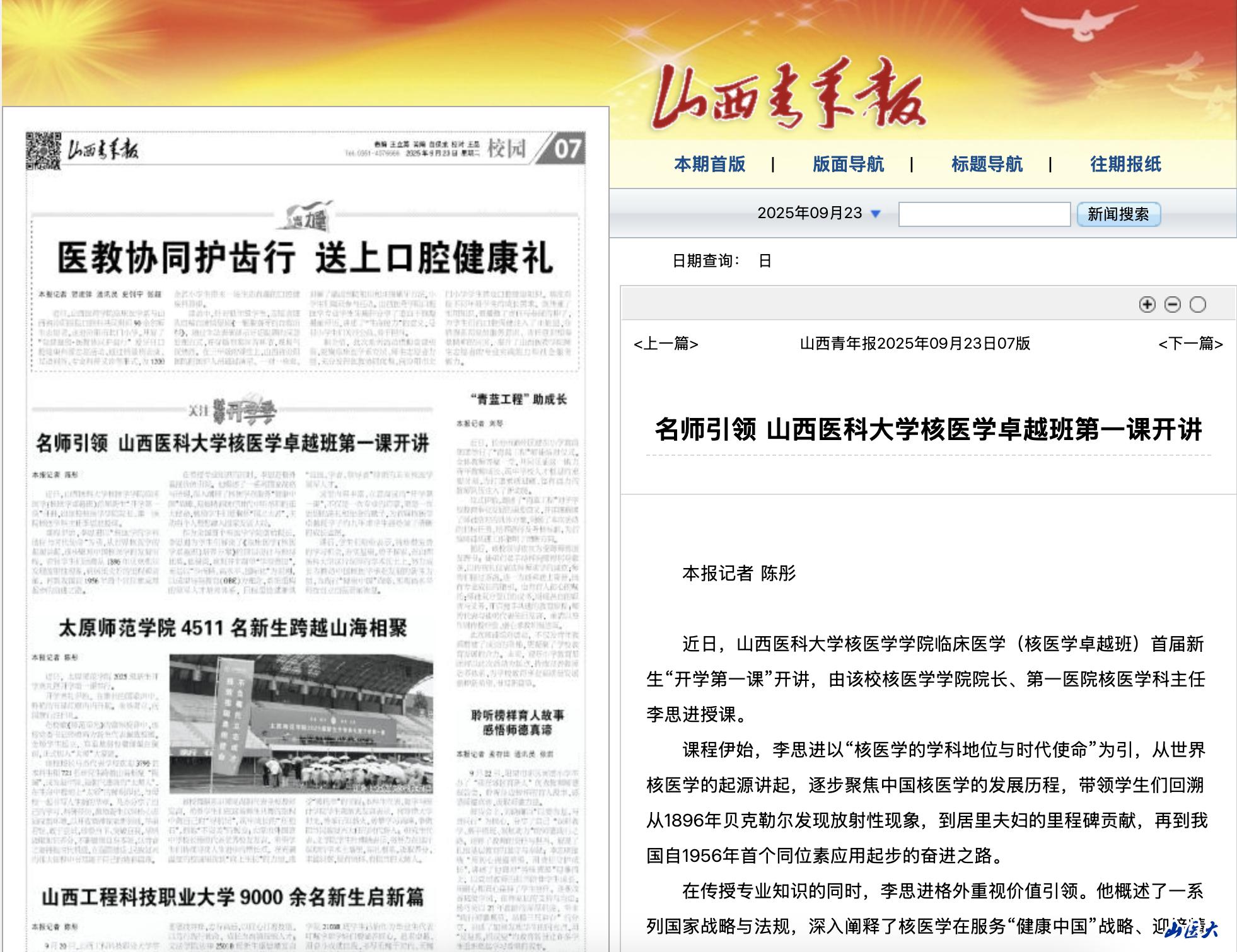 9月9日,《中国教育报》“教改风采”版刊发我校党委书记王军、校长解军的署名文章《推进“大思政课”建设 深化医德教育改革——山西医科大学“大思政—1345”“新医德”育人模式的探索与实践》。文章从“根植红色基因 百年文脉筑牢学校医德教育之魂”“紧扣时代之问 三阶段迭代升级学校医德教育模式”“深化系统创新 夯实学校医德教育核心架构”“坚持以生为本 打造‘五位一体’医德教育矩阵”“直面现实之需 问题导向破解学校...
