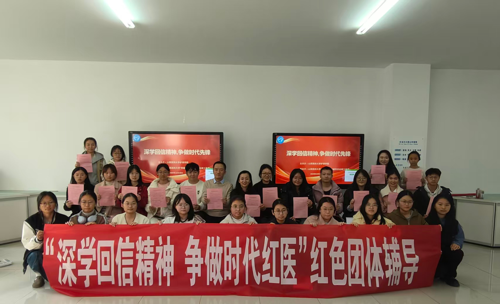 为深入学习贯彻习近平总书记给天津大学全体师生的回信的精神实质与核心要义,引导青年学子将个人理想融入时代洪流,2025年10月29日上午,由山西医科大学护理学院主办、“明德润心访”辅导员名师工作室承办的“深学回信精神,争做时代先锋”主题红色团体辅导活动在至真楼B205教室隆重举行。活动特邀中北大学仪器与电子学院团委书记郭乐祥副教授担任主讲嘉宾,学院全体党员与学生干部参与。