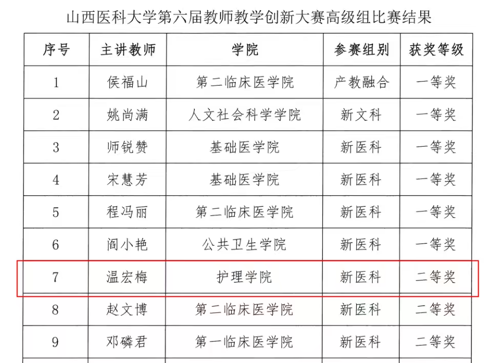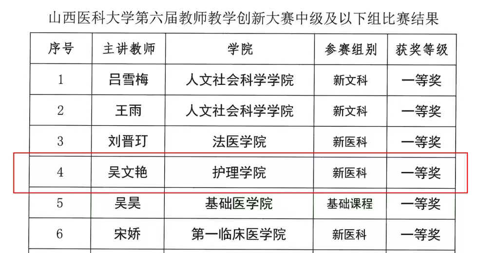 在山西医科大学举办的第六届教师教学创新大赛中,我院6名教师参加了比赛。他们凭借出色的教学设计与创新实践,取得了优异成绩。吴文艳老师荣获中级职称组新医科赛道一等奖;温宏梅老师荣获高级职称组新医科赛道二等奖;董姗姗、刘奕娜、亢剑老师分别获得中级职称组优秀奖。