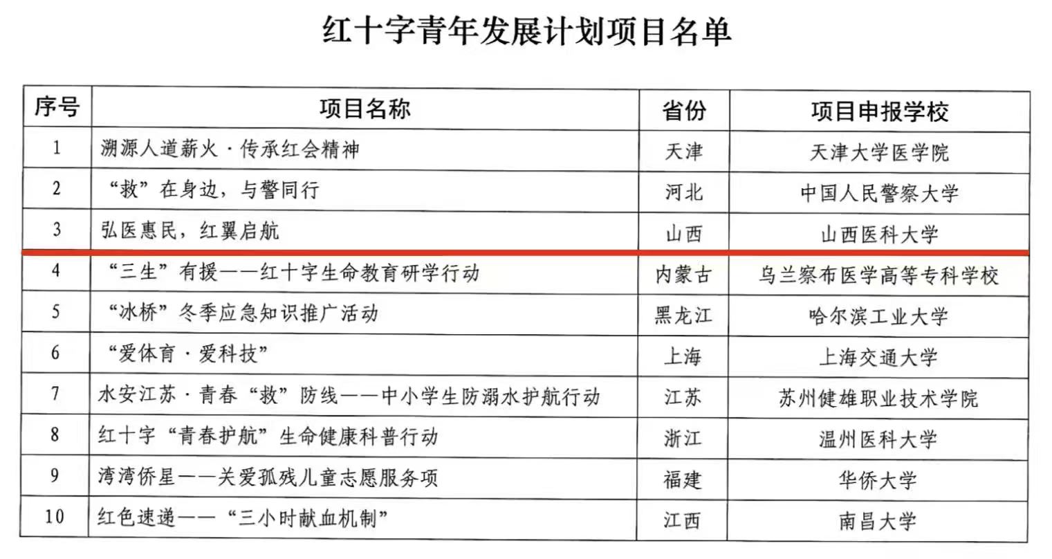 近日,我院“弘医惠民·红翼启航——山西医科大学南丁格尔志愿护理服务分队进社区健康促进行动”入选中国红十字会总会组织实施的“红十字青年发展计划”全国资助项目名单,成为山西省本批次唯一入选项目。