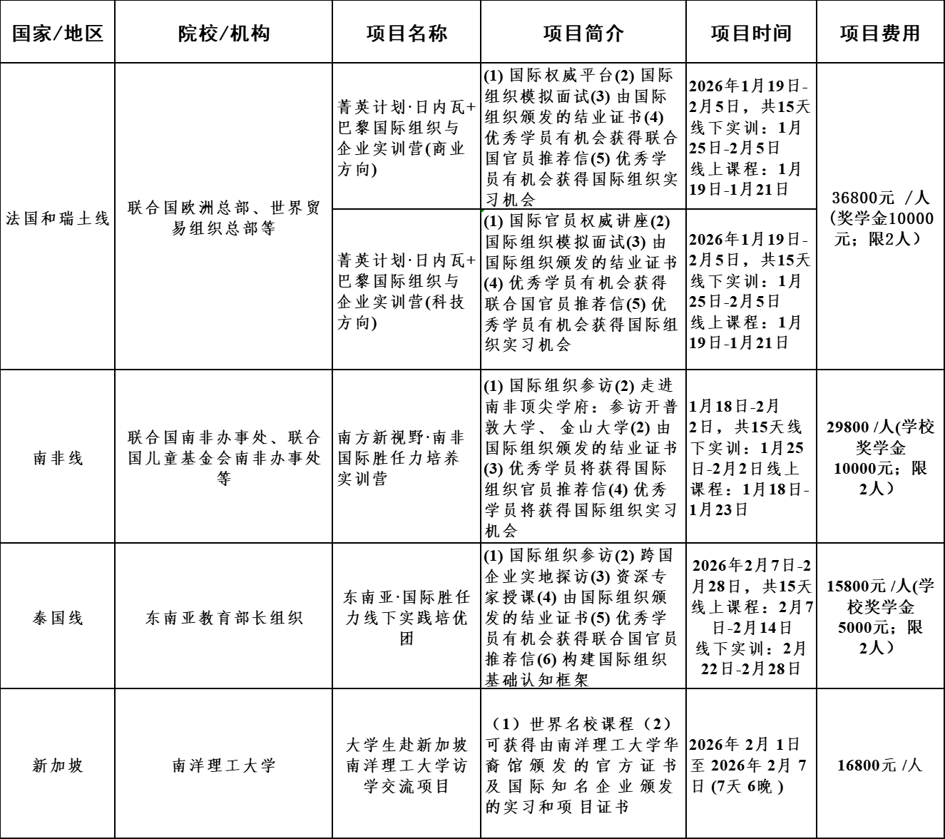 为深入推进人才培养模式改革,加快培养国际化高素质人才,根据学校相关政策,现将报名2026年寒假出国(境)短期线下访学项目通知如下: