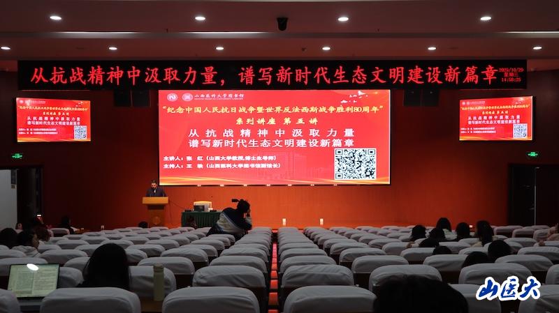 10月29日下午,我校图书馆举办“纪念中国人民抗日战争暨世界反法西斯战争胜利80周年”系列讲座第五讲——“从抗战精神中汲取力量,谱写新时代生态文明建设新篇章”。本次讲座特邀山西大学教授、博士生导师张红担任主讲,来自各院系的300余名师生参加了本次活动。讲座由图书馆副馆长王轶主持。