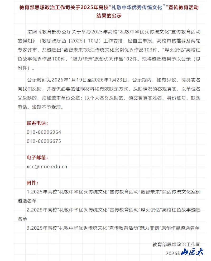 据悉,本次活动经自主申报、高校审核推荐及两轮专家评审,共遴选出“数智未来”焕活传统文化案例优秀作品103件、“烽火记忆”高校红色故事优秀作品100件、“魅力非遗”原创优秀作品102件。