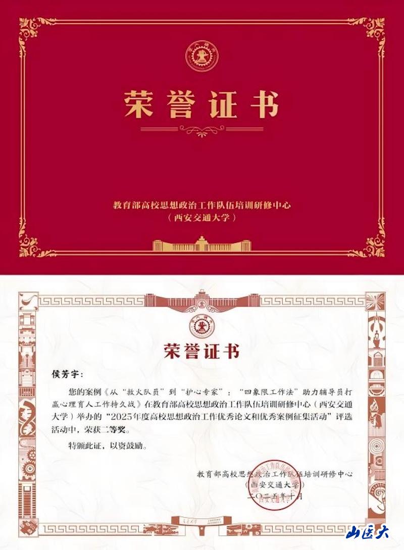 近日,教育部高校思想政治工作队伍培训研修中心(西安交通大学)公布“2025年度高校思想政治工作优秀论文和优秀案例征集活动”评选结果。我校口腔医学院思想政治辅导员、畅游青春辅导员工作室负责人侯芳宇提交的案例《从“救火队员”到“护心专家”:“四象限工作法”助力辅导员打赢心理育人工作持久战》荣获优秀案例二等奖。