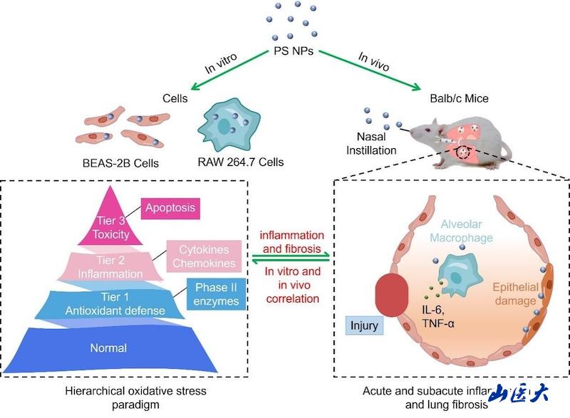 研究团队综合运用人支气管上皮细胞(BEAS-2B)、鼠巨噬细胞(RAW264.7)及Balb/c小鼠体内模型,对PS NPs的肺毒性信号通路进行了系统性探索,在机制探索方面取得了突破。