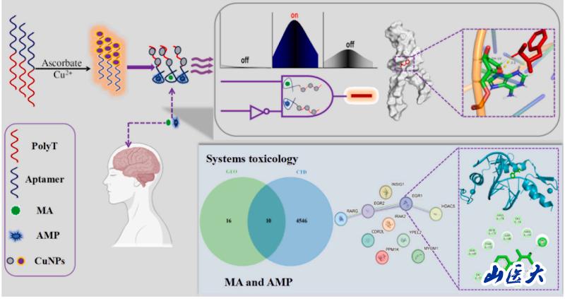团队通过分子对接截断40nt适配体,获得28nt新型适配体MA-3,该适配体对两种物质的亲和力显著提升。基于此构建荧光“抑制型”逻辑门检测系统:以MA-3为识别元件,poly(T)-ssDNA原位合成铜纳米颗粒为探针,实现“off-on-off”检测。其对甲基苯丙胺检测线性范围0.8–100 nmol/L(检出限0.2 nmol/L),苯丙胺3.7–920 nmol/L(检出限0.5 nmol/L),头发、尿液样品加标回收率96.6%–104.4%,RSD<9.8%,性能媲美GC-MS。同时,网络毒理学鉴定26个成瘾相关靶点,PPI分析确定RARG、EGR1、EGR2、HDAC5为核心标志物。分子对接显示,两种物质与这些靶点结合能< -5.0 kcal/mol,提示滥用或有促肿瘤风险;还发现二者可与头发角蛋白结合,为毛发检测提供依据。