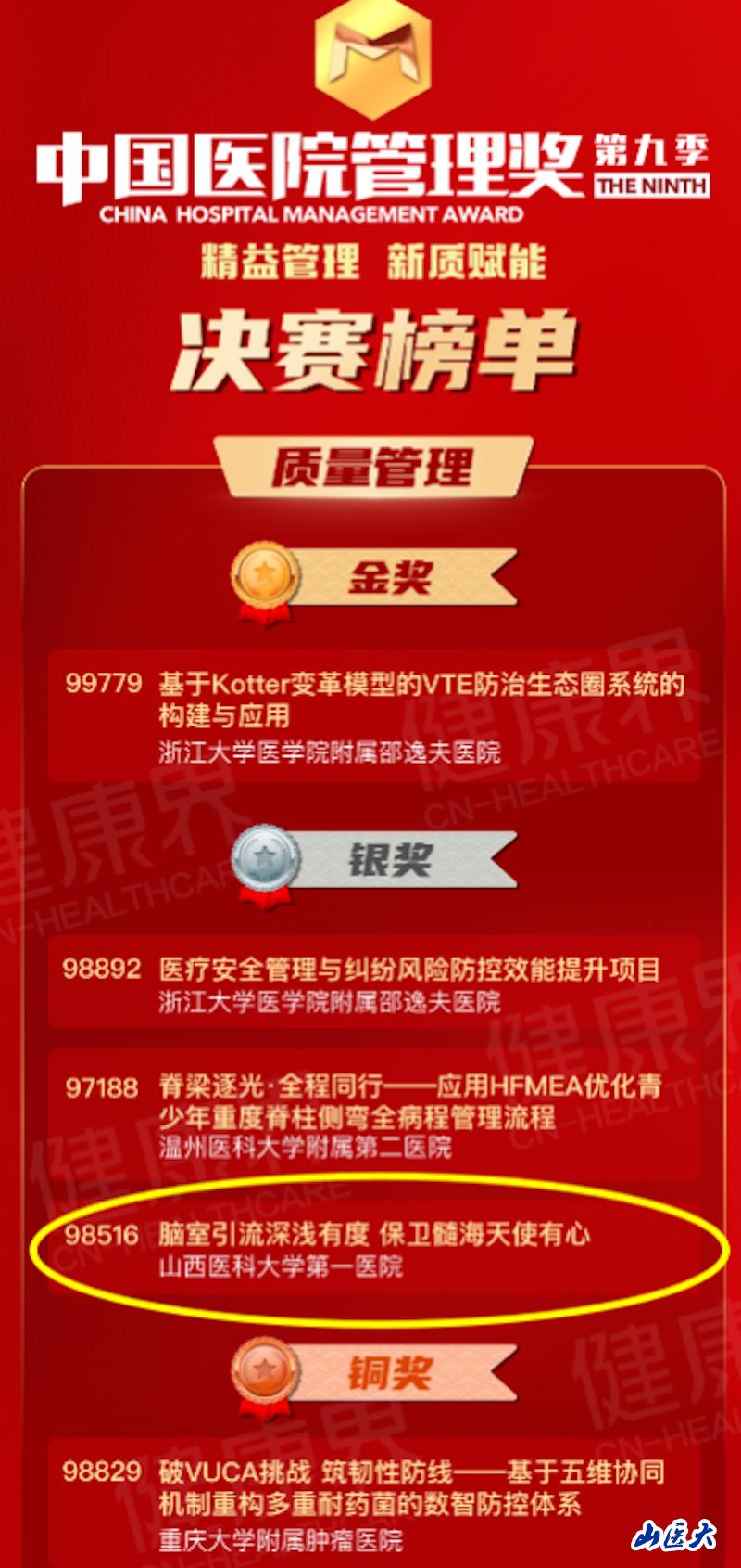 10月18日,第九季中国医院管理奖质量管理组主题决赛在上海举办经过多轮遴选,全国共20项优秀案例晋级决赛,我校附属第一医院神经外科报送的案例《脑室引流深浅有度 保卫髓海天使有心》从众多优秀案例中脱颖而出,荣获“质量管理”组全国银奖,充分彰显了医院在医疗质量管理与患者安全领域的深厚积累与持续创新能力。