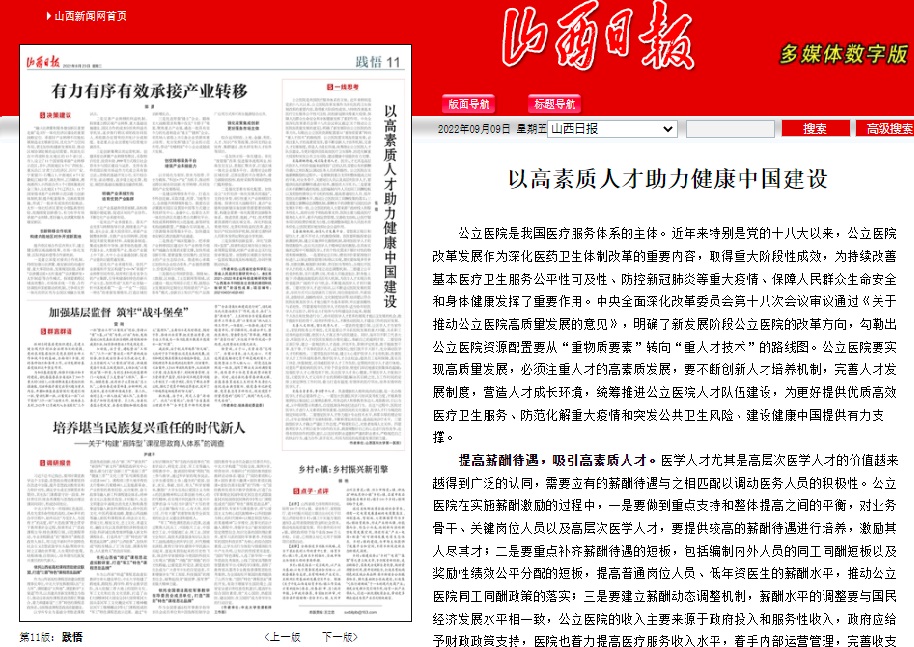 公立医院是我国医疗服务体系的主体。近年来特别是党的十八大以来,公立医院改革发展作为深化医药卫生体制改革的重要内容,取得重大阶段性成效,为持续改善基本医疗卫生服务公平性可及性、防控新冠肺炎等重大疫情、保障人民群众生命安全和身体健康发挥了重要作用。中央全面深化改革委员会第十八次会议审议通过《关于推动公立医院高质量发展的意见》,明确了新发展阶段公立医院的改革方向,勾勒出公立医院资源配置要从“重物质要素”转向“重人才技术”的路线图。公立医院要实现高质量发展,必须注重人才的高素质发展,要不断创新人才培养机制,完善人才发展制度,营造人才成长环境,统筹推进公立医院人才队伍建设,为更好提供优质高效医疗卫生服务、防范化解重大疫情和突发公共卫生风险、建设健康中国提供有力支撑。