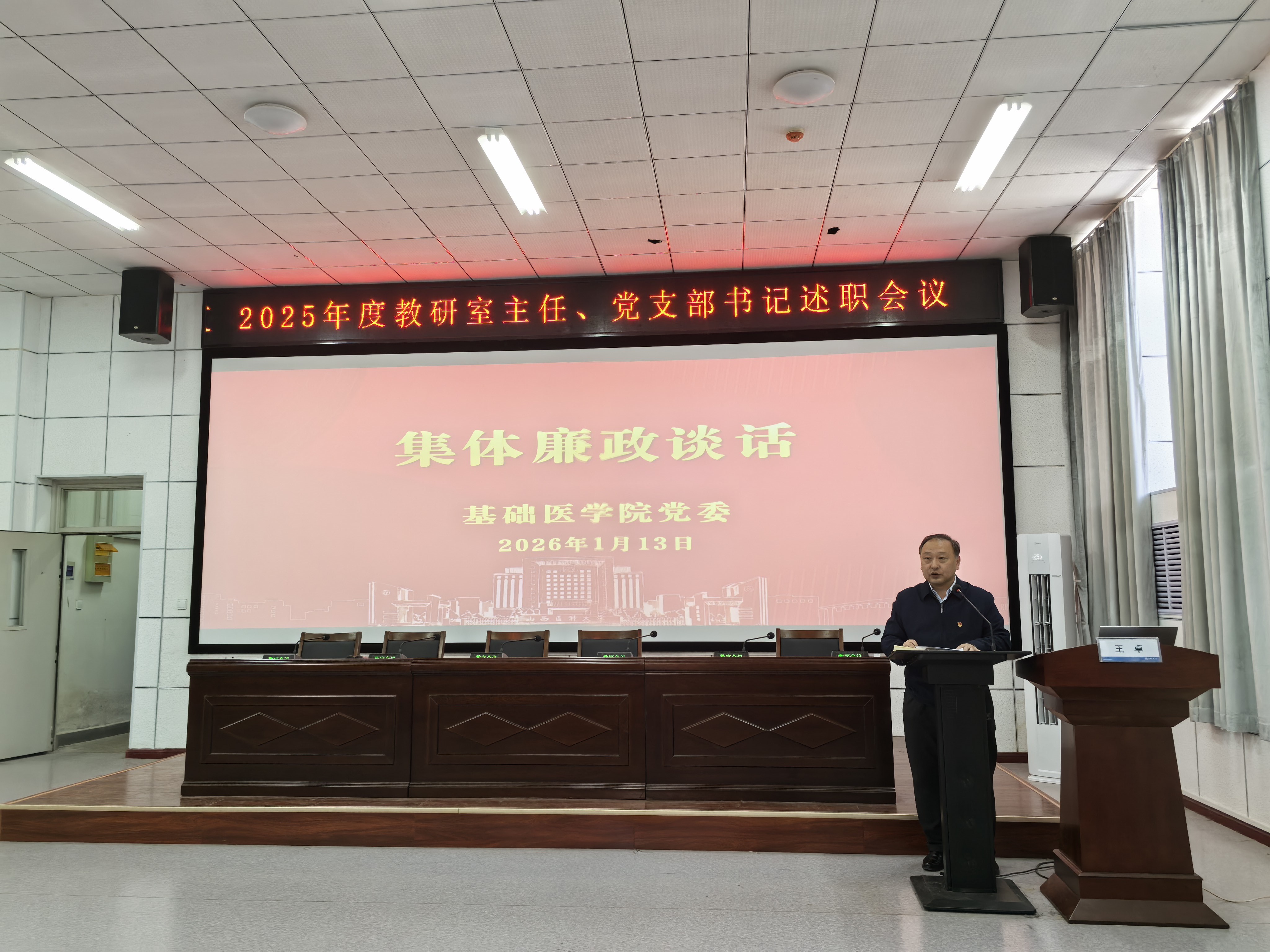 2026年1月13日,基础医学院组织召开了2025年度教研室主任、党支部书记述职会议。学院领导班子、党委委员、教研室/实验室负责人、党支部书记及教师代表参加会议。会议由副院长王晓晖主持。