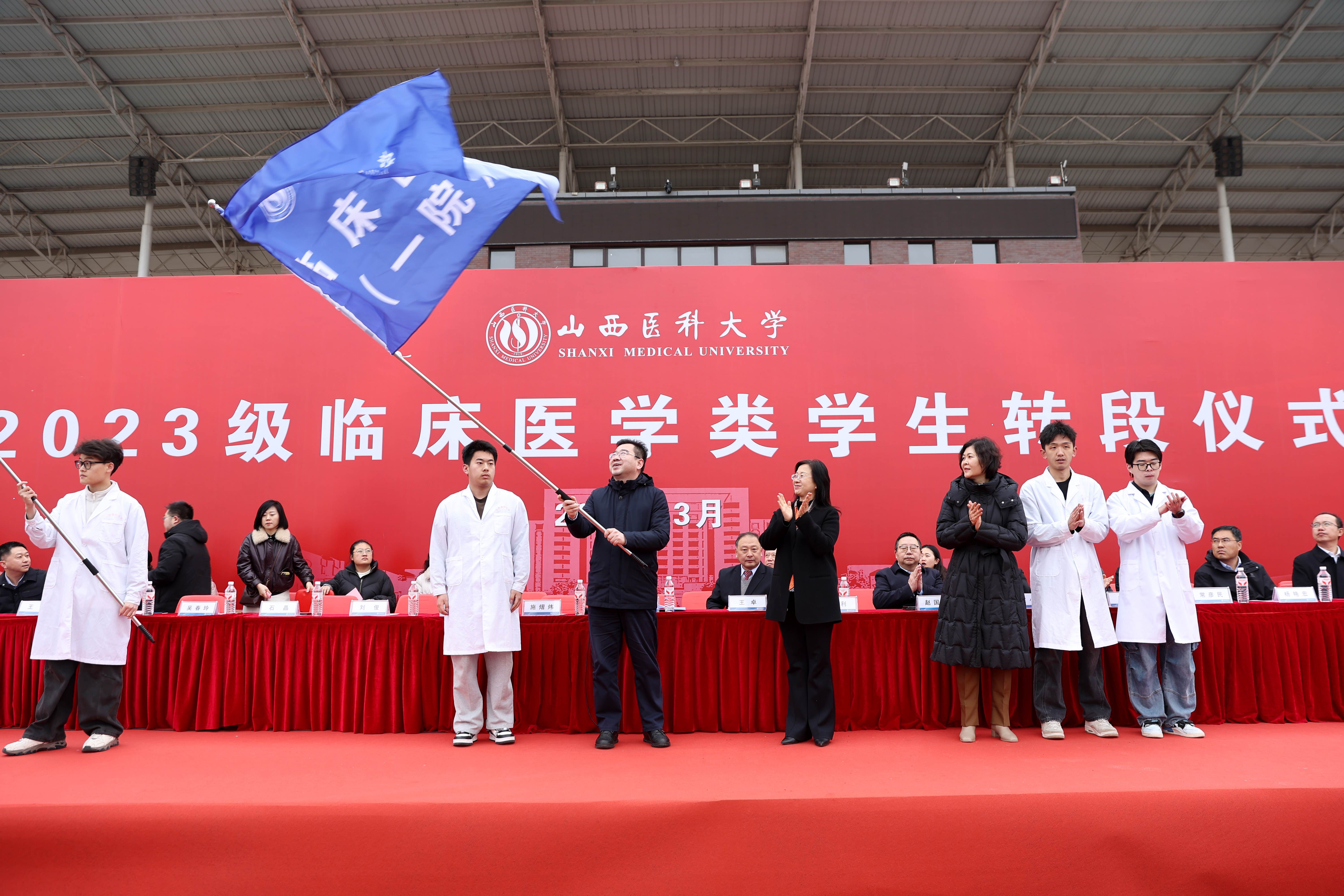 校党委常委、副校长武志芳向各临床医学院授旗。一面面象征着医学使命、责任担当的旗帜交接传递,寓意着医者初心的接力、医学使命的传承,标志着全体转段学生正式告别基础理论学习阶段,昂首迈入临床实践新征程。