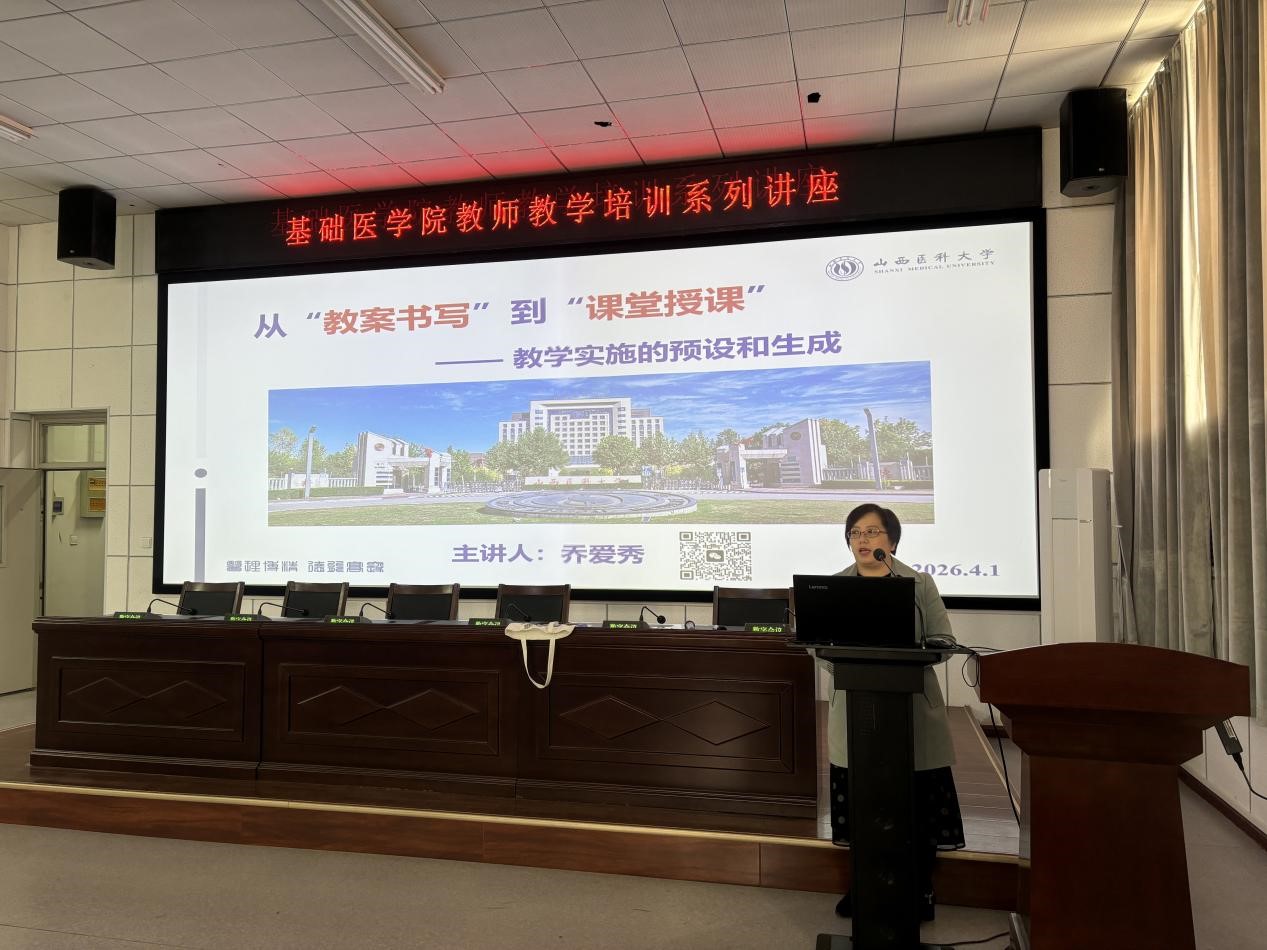 为进一步强化教师教学基本功,规范教学实施流程,提升课堂教学质量,助力高素质专业化教师队伍建设,4月1日,基础医学院在逸夫楼一层报告厅举办教师教学培训系列讲座。讲座特邀学院教学督导委员会主任委员乔爱秀老师作题为《从“教案书写”到“课堂授课”——教学实施的预设与生成》的专题分享,学院各教研室骨干教师、青年教师及教学管理人员到场参训学习,基础医学院副院长王晓晖主持讲座。