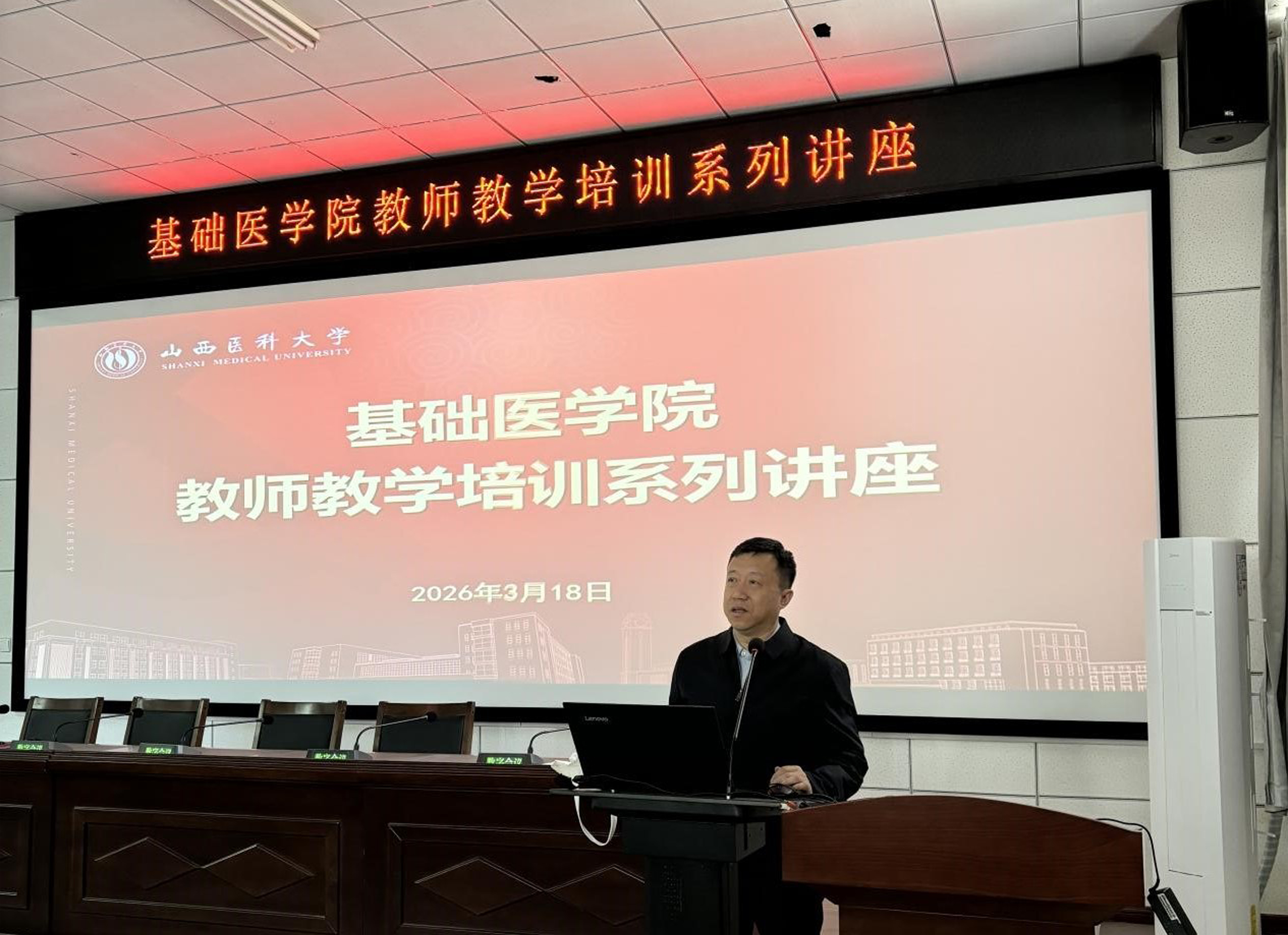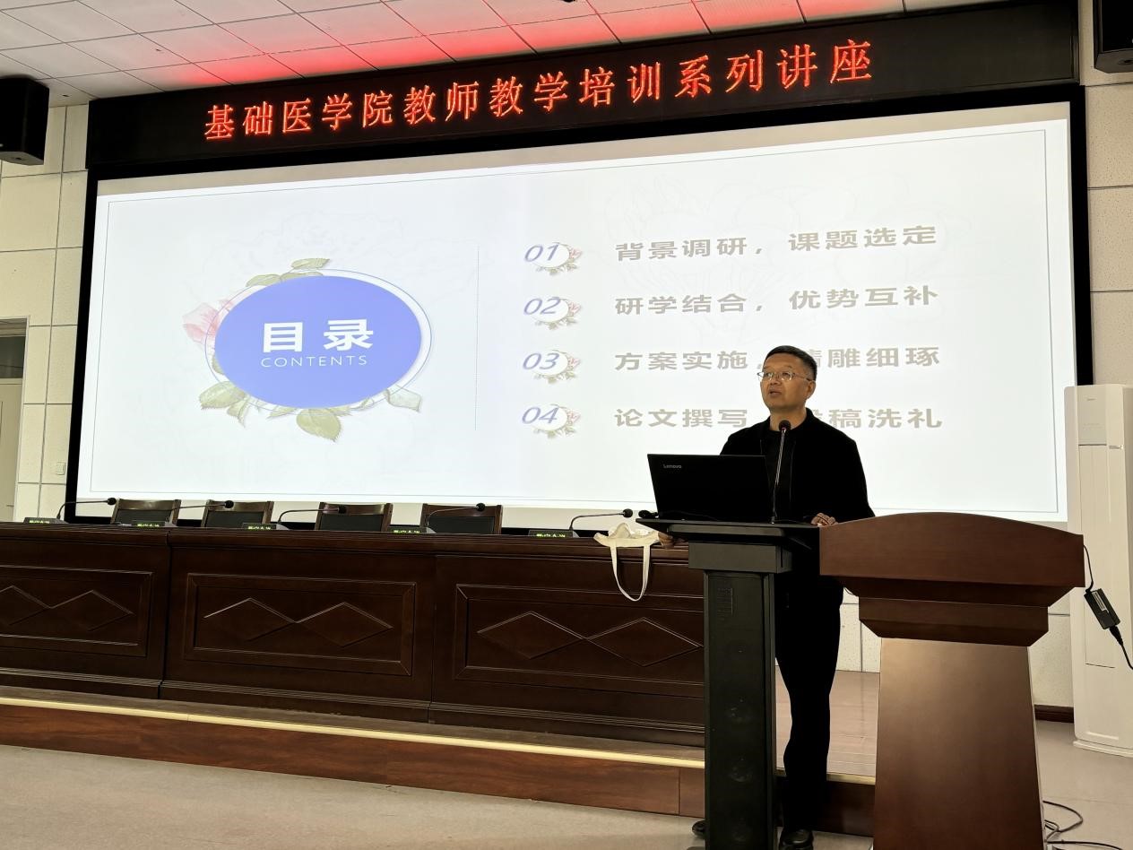 为深入推进教育教学改革,促进科研与教学深度融合,提升教师教学研究与学术写作能力,助力高素质专业化教师队伍建设,3月18日,基础医学院在逸夫楼一层报告厅成功举办教师教学培训系列讲座。本次讲座特邀人体解剖学教研室曾俊峰老师作题为“教改SCI写作心得:让科研融入教学领域”的专题分享,学院各教研室骨干教师、青年教师及教学管理人员到场参训学习,基础医学院副院长王晓晖主持讲座。