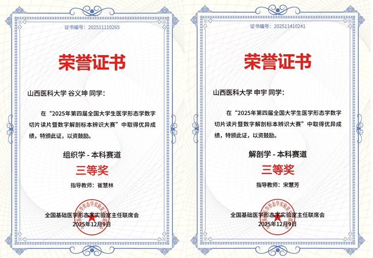 2025年12月7日,由我校基础医学院组织的第四届高等医学院校大学生数字形态学读片和数字解剖标本辨识技能大赛圆满落幕。我校临床医学(“5+3”一体化)、临床医学(五年制)、基础医学、麻醉学等多个专业的学生在激烈竞争中脱颖而出,共有36人成功进入决赛,并在解剖学赛道和组织学赛道分获三等奖1项。