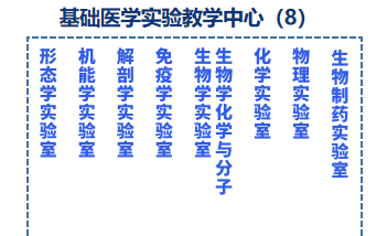 机能学实验室、形态学实验室、医用化学实验室、医用物理学实验室、微生物与免疫学实验室、生物制药实验室、人体解剖学实验室、生物化学与分子生物学实验室。