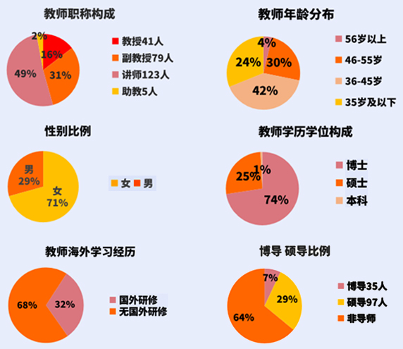 5. 师资队伍 截至目前教职工298人,其中教师251人,教辅 43 人,管理人员 10 人;教授 41 人,副教授 79 人;博士生导师 21人,硕士生导师 83 人。