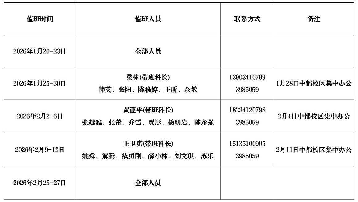 2、1月20-23日,2月25-27日全部人员在中都校区正常上班;1月26日-2月24日期间(节假日除外)每周三在中都校区集中办理业务,如有需要紧急处理的财务业务,请与当周带班科长联系。