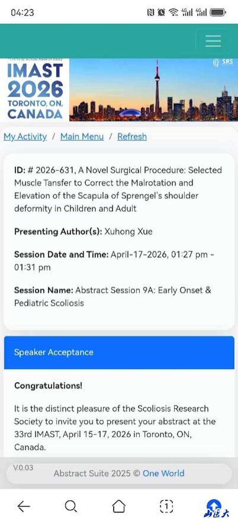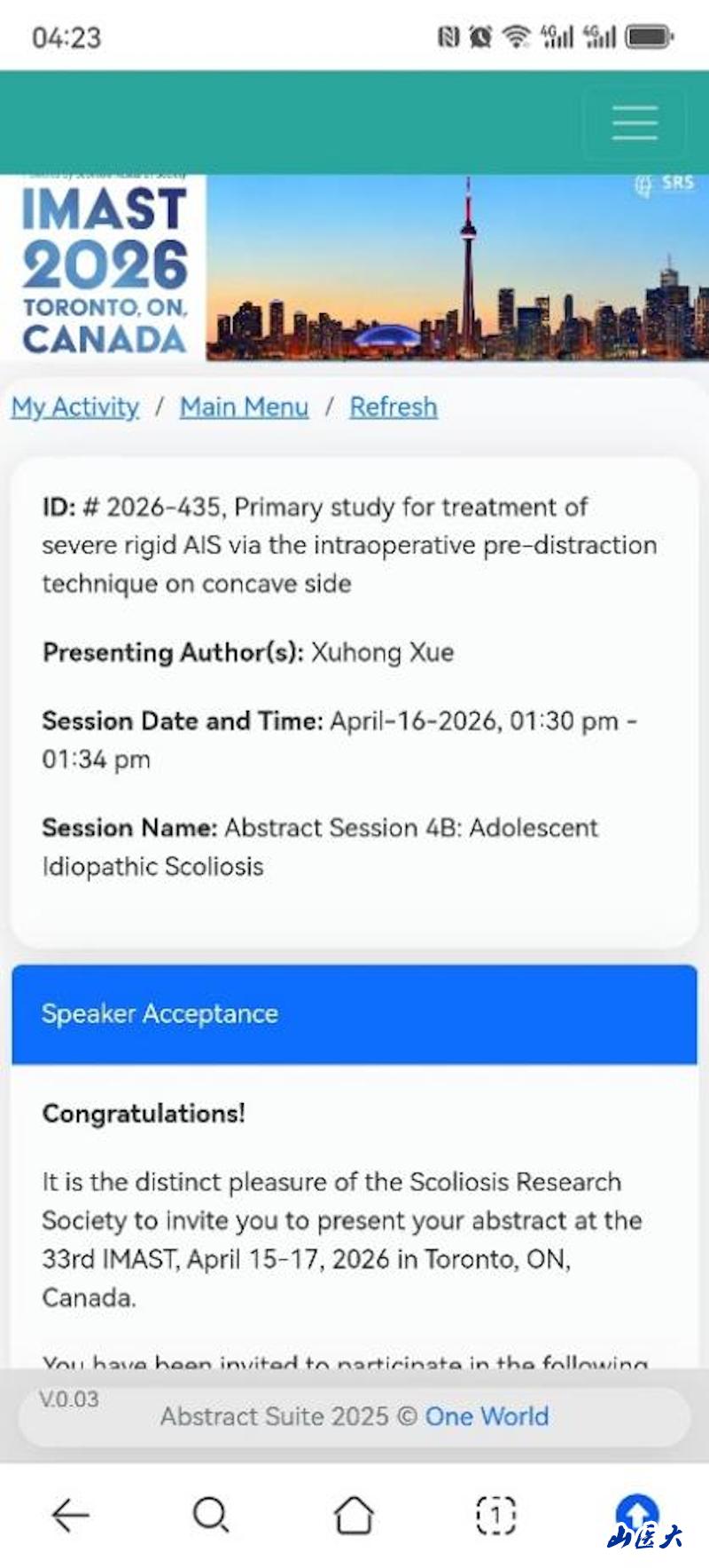 近日,第33届IMAST会议(国际脊柱先进技术会议)学术论文评选结果出炉,会议将于2026年4月15日至17日在加拿大多伦多举办。我校附属第二医院骨科脊柱畸形专业组薛旭红教授的2篇研究性学术论文入选,受邀在IMAST会议上做大会发言。