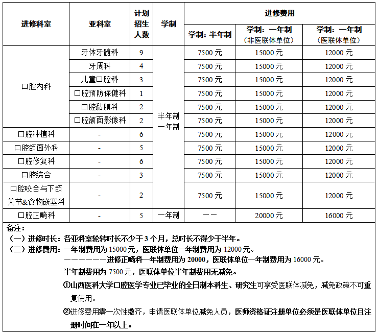 为积极响应《健康口腔行动方案》中“加强基层人才队伍建设”要求,支持口腔医学从业人员持续学习与能力升级,切实履行社会责任。同时,得益于我院东院区扩建、椅位增加,能更好地容纳优秀医师来我院学习,现行新版进修医师收费标准。旨在让更广泛的医生,特别是来自基层医院的优秀人才,减轻经济负担,获得进修深造机会。调整后的招生计划如下表: