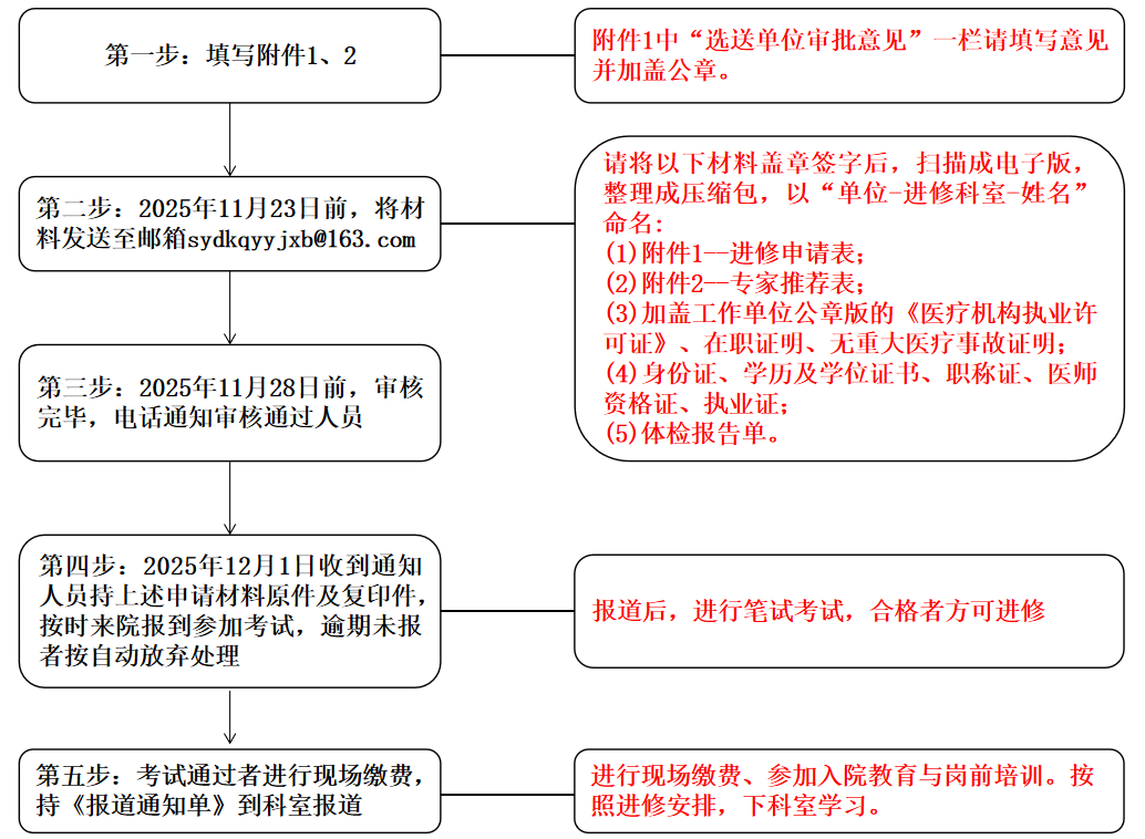 1.我院将对申请表进行审核,审核通过后将会以电话的形式进行通知,请保持电话畅通。接到通知的人员,请携带相关申请材料,按指定时间来院报到参加考试,合格者方可进修。