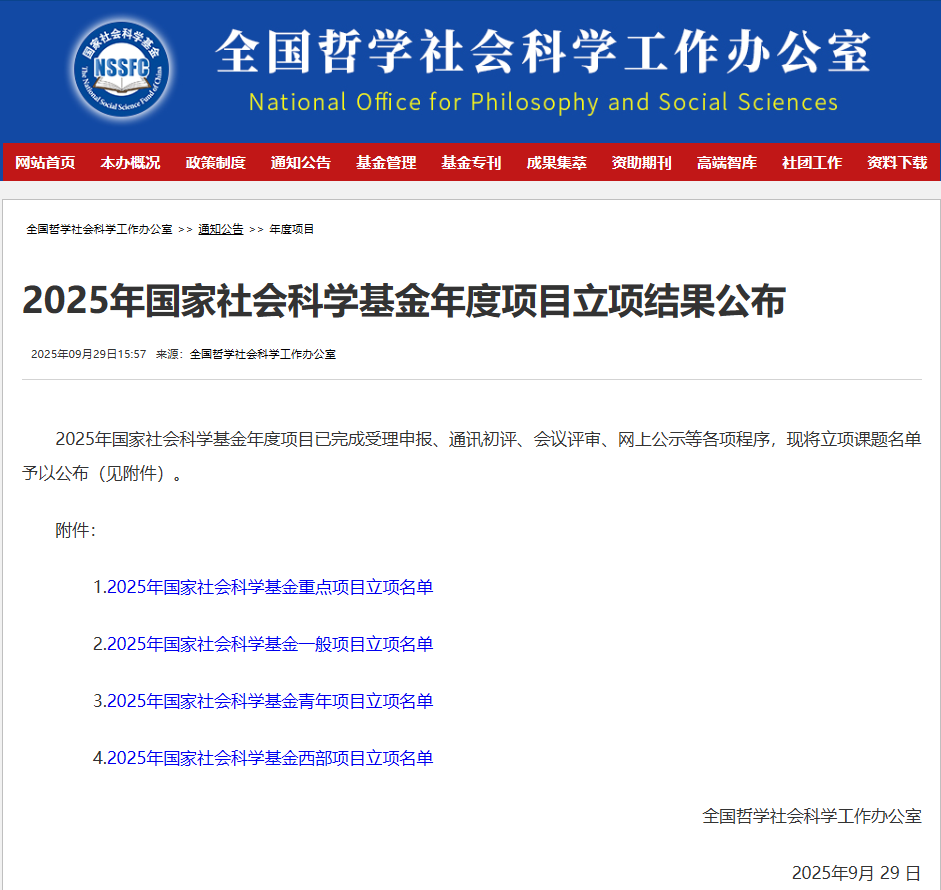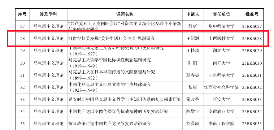 近日,全国哲学社会科学工作办公室正式公布了2025年度国家社会科学基金项目立项名单。我院王绍源教授作为主持人申报的课题《21世纪拉美左翼“美好生活社会主义”思潮研究》成功入选,喜获立项。