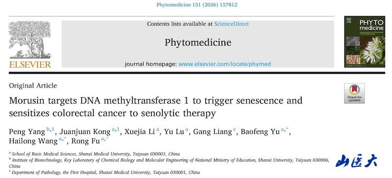 近日,我校基础医学院付荣副教授、王海龙教授、于保锋教授与山西大学杨鹏副教授合作在天然产物抗肿瘤作用机制研究方面取得新进展。研究成果以“Morusin targets DNA methyltransferase 1 to trigger senescence and sensitizes colorectal cancer to senolytic therapy”为题,发表于药学领域一区期刊《Phytomedicine》。我校为本研究的第一完成单位。