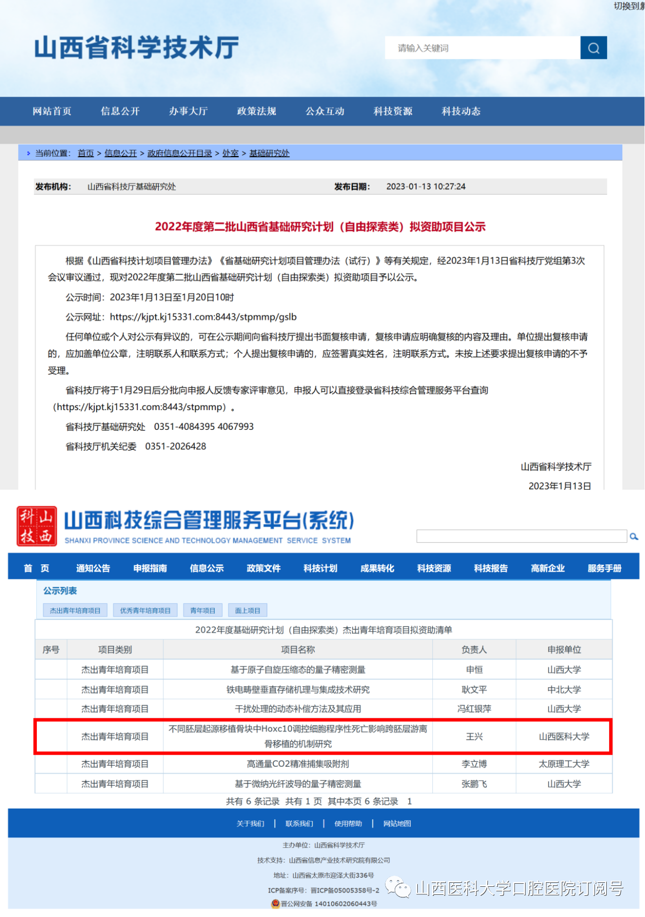 此外,省科技厅2022年度第二批山西省基础研究计划(自由探索类)项目评审结果揭晓,口腔医(学)院共获批6项,稳居山西省口腔专业第一位。王兴教授申报的课题《不同胚层起源移植骨块中Hoxc10调控细胞程序性死亡影响跨胚层游离骨移植的机制研究》荣获2022年度基础研究计划(自由探索类)杰出青年培育项目。该项目首次以跨胚层骨移植中细胞程序性死亡调控为切入点,初步揭示细胞程序性死亡调控自体骨移植免疫耐受的机制,为自体组织移植免疫调控机制拓展了视角和理论基础。