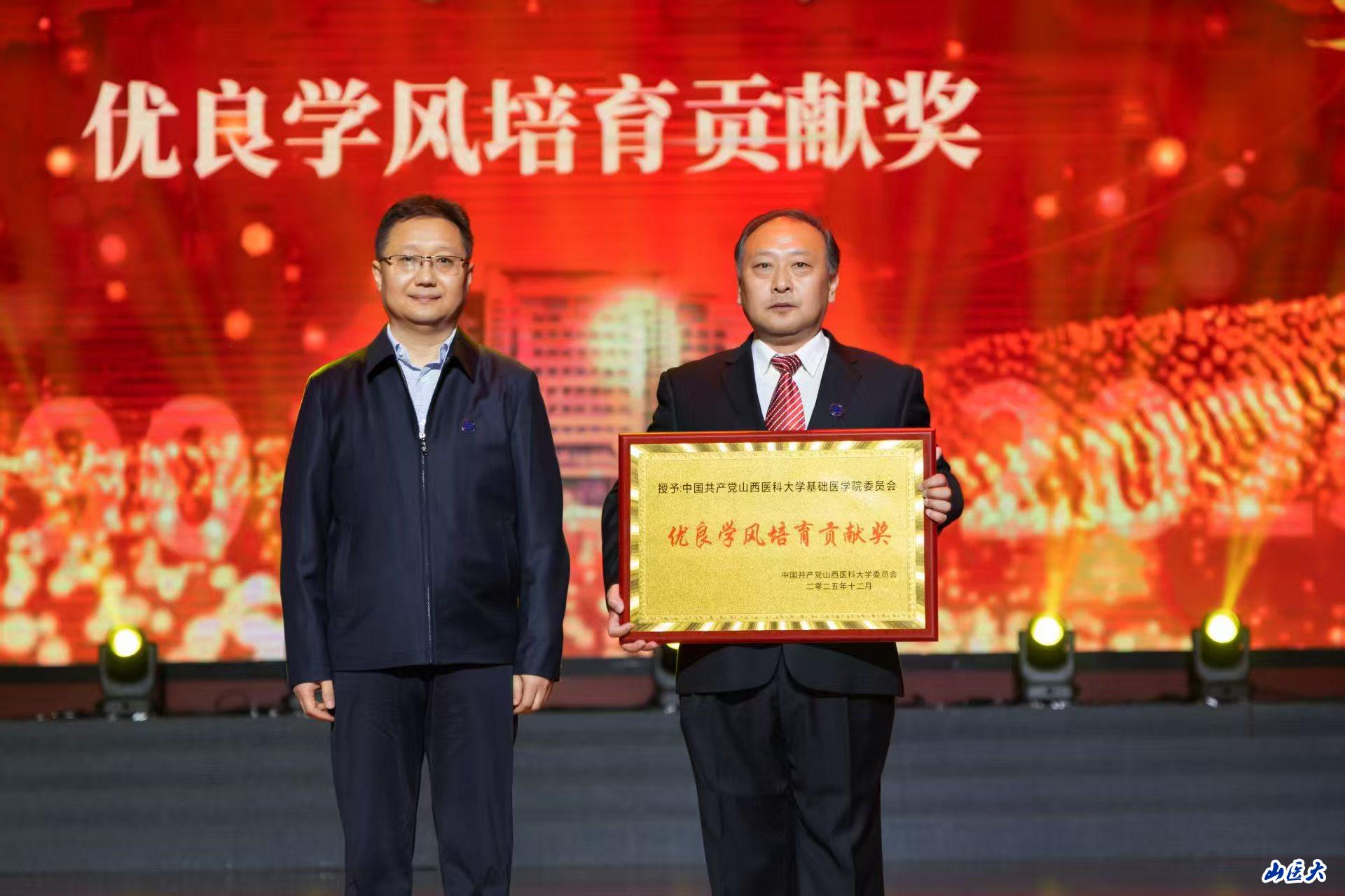 王军为基础医学院党委颁发了“优良学风培育贡献奖”,充分肯定了学院党委在学校学风建设中作出的突出贡献。“正学风 比勤奋”学习竞赛活动自1990年创办以来,基础医学院历届党委班子坚持不懈,坚守初心,历经三十五载、举办二十八届,辐射全校,形成学校育人体系中的重要特色品牌。