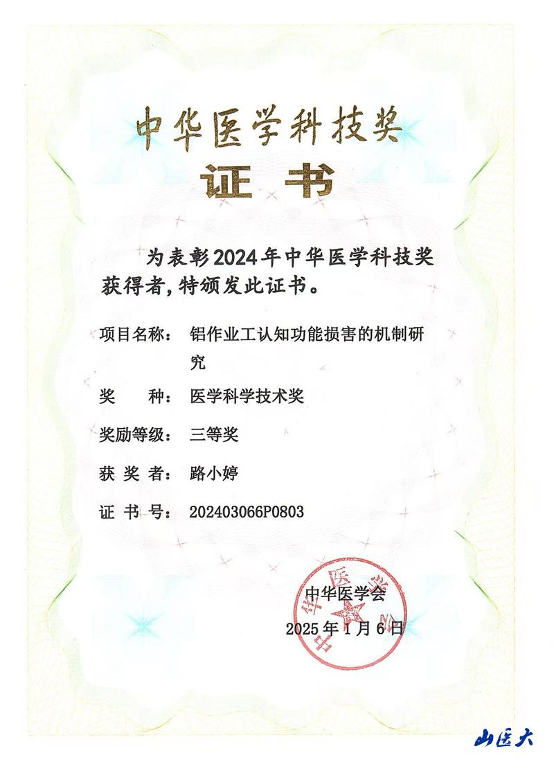 牛侨团队完成的“铝作业工人认知功能损害的机制研究”,系统揭示了铝暴露导致认知功能损害的作用机制,为职业健康防护与公共卫生政策制定提供了依据。该成果不仅充分体现了我校科研人员在医学前沿领域的持续探索,也为高水平公共卫生学院高质量发展作出了重要贡献。该团队将继续聚焦职业危害因素,开展更为深入的毒性研究和科学转化,为职业健康防护贡献山医智慧。