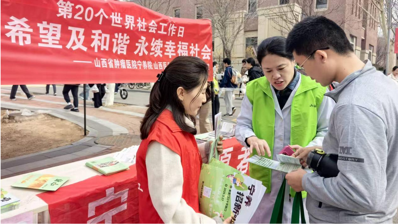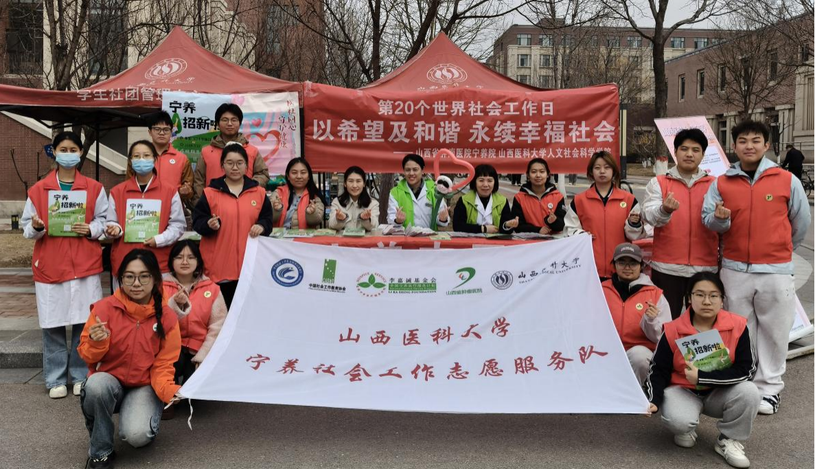 3月17日,正值第20个国际社工日,我校宁养志愿服务队开展了社工日宣传暨年度队员招募活动。山西省肿瘤医院宁养院主任刘冰新、侯蓉老师,人文社会科学学院副书记韩瑜及分团委负责人田璐敏和宁养队20名志愿者参加活动。