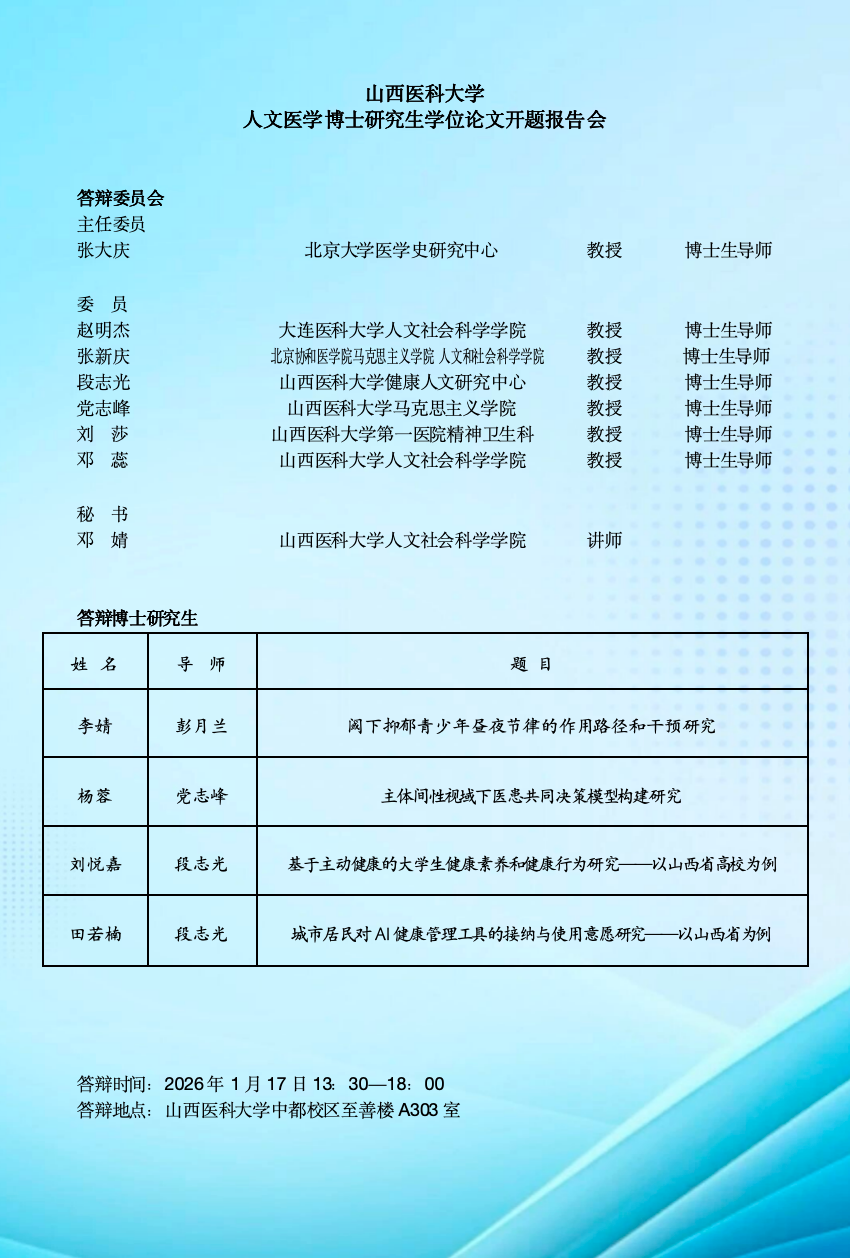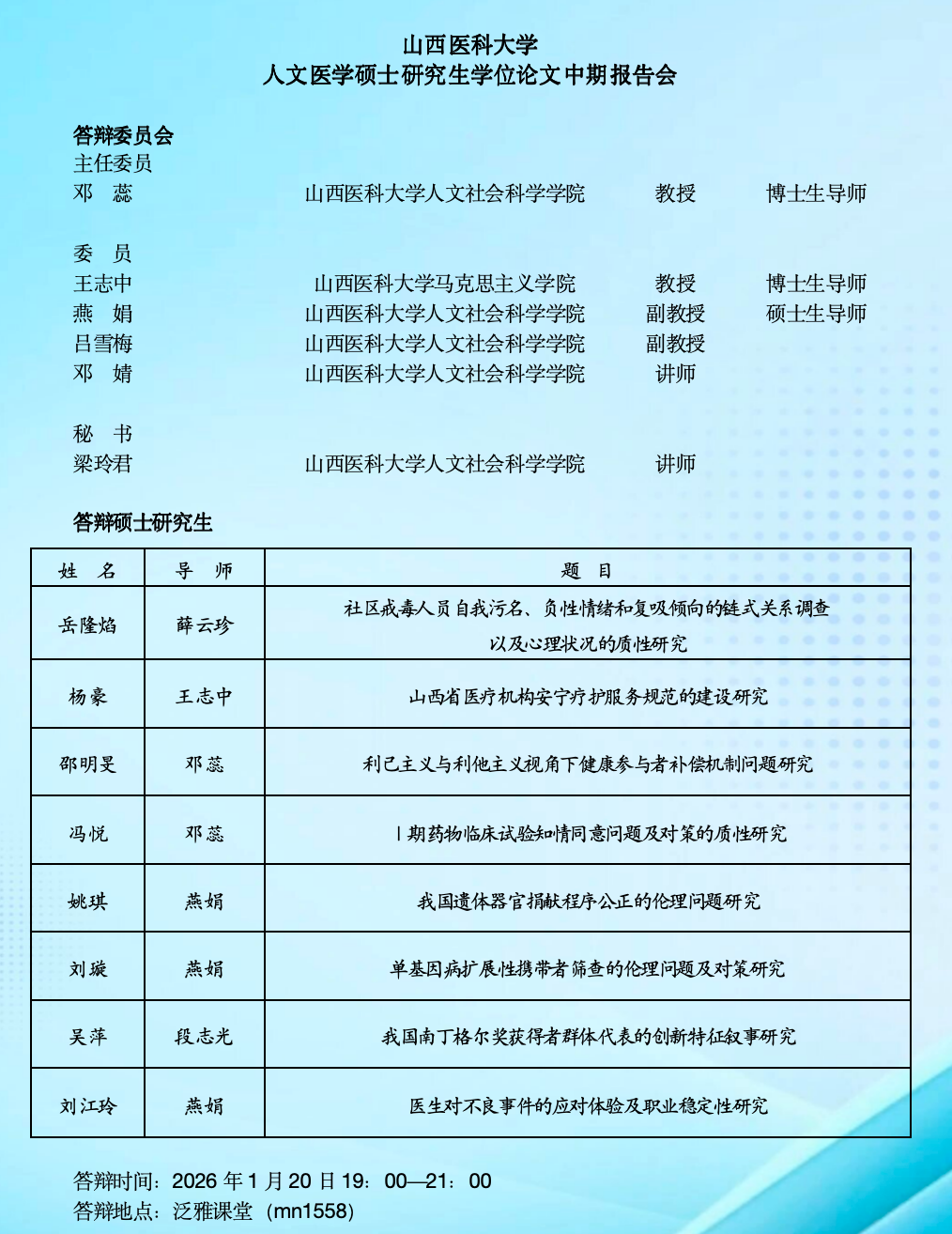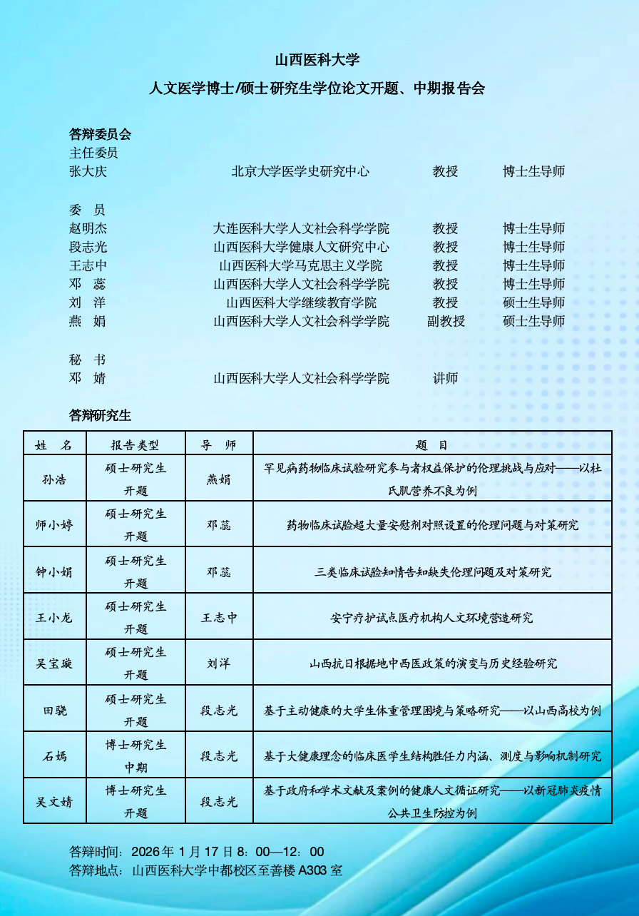 2026年人文医学博士/硕士研究生学位论文开题、中期报告会