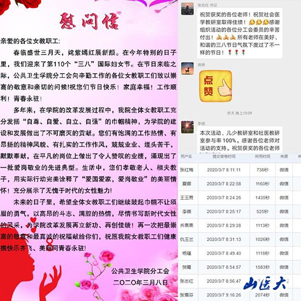 为纪念第110个“三八”国际妇女节,在疫情防控居家期间营造良好的节日氛围,我校公共卫生学院分工会积极响应校工会委员会的安排部署,结合疫情实际情况,精心制定了活动方案,开展了“性别平等及女职工权益保护、防疫知识”网上有奖竞答、征集疫情防控“一封家书”、征集一线女职工的感人事迹等一系列节日庆祝活动,为学院女教职工送上了节日的问候和祝福。