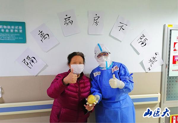 下午,在工作间隙大家开始布置现场:花束3朵,黄梨数个,话语一行,活动现场简单朴素。队员们为即将出院和病情稳定的患者送上了惊蛰的吉祥物——梨。队员双手递上,幽默地对出院患者说:“今天,由我送您“梨”开隔离病房,恭喜您出院啦!”患者高兴地说道:“好的好的,谢谢,我愿意这样地“梨”开!”队员为性格开朗的“方舱奶奶”送上节日问候,之所以称呼她为“方舱奶奶”,是因为她是从方舱医院转来的。她高兴地说:“是的嘛,惊蛰是要吃梨的!隔离病房“隔离”的是病毒,隔不断的是情感。感谢你们从山西那么远来帮助我们,还有这么实在的节日问候。真心感谢你们!”队员们还特意给“焦虑哥”送上了祝福。原来,上午查房,患者自己无意听到一句:胸部CT显示有肺气肿,自己就“对号入座”了,一个下午都焦虑不安。队员联系医生,进入病房查房后才得知,当时是医生在说别的事情,他自己只是“道听途说”而已,结果虚惊一场。“来个梨,大吉大利,压压惊”队员说。“要的要的,这个梨要的”“焦虑哥”不好意思地说。短暂地放松后,队员们又投入到了紧张有序的工作中,她们都在竭尽所能地为争取这场人民战争的最终胜利而努力奋斗!