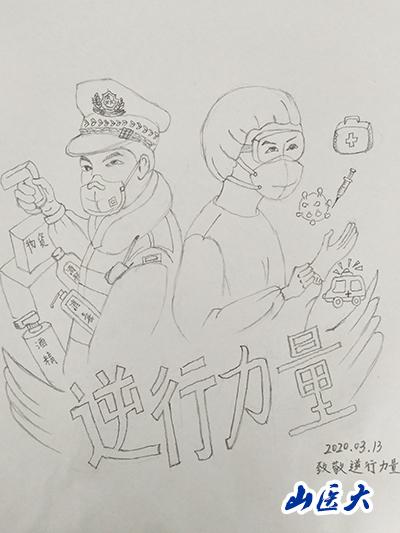 【作品简介】无数逆行者在抗击新冠疫情战役中英勇无畏,用生命守护生命,医生、护士、警察、外卖员、志愿者……各行各业都在用自己的专业服务群众,迸发出强大的中国力量,怀揣着“不破楼兰终不还”的必胜信念,勇敢逆行于抗疫一线。愿逆行英雄们早日平安回家!原作尺寸:21.0cm×29.7cm(A4纸)。