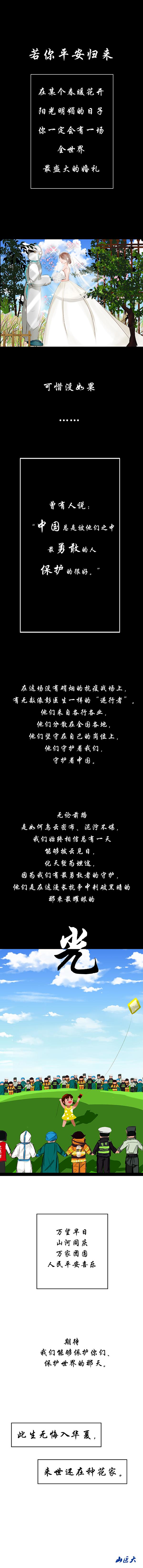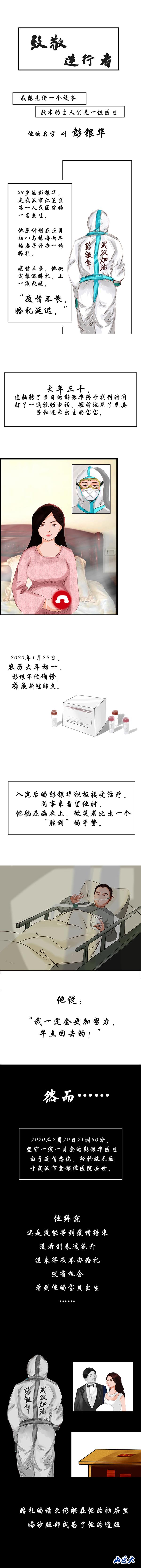 【作品简介】疫情当前,以医护人员为首的、来自各行各业的逆行者们用勇气和生命为我们搭建了一处安全港。他们无私奉献、他们英勇向前,他们值得所有人的尊敬。他们是最勇敢的人。谨以此漫画致敬逆行者们和坚守岗位的人们。原作尺寸(cm):图1:宽21*高234;图2:宽21*高230;图3:长181*宽135;图4:宽135*长181。分辨率均为300dpi。备注:作品原创,部分参考内容说明如下:图1:试剂盒、彭医生在病床上、彭医生的婚纱照参考网络照片。图2:“婚礼”绘制时背景中有部分使用公开素材;图4:“守护者”各行各业的逆行者背影有参考网络照片。无任何侵权、抄袭行为。本人保证作品原创,一切责任自负。