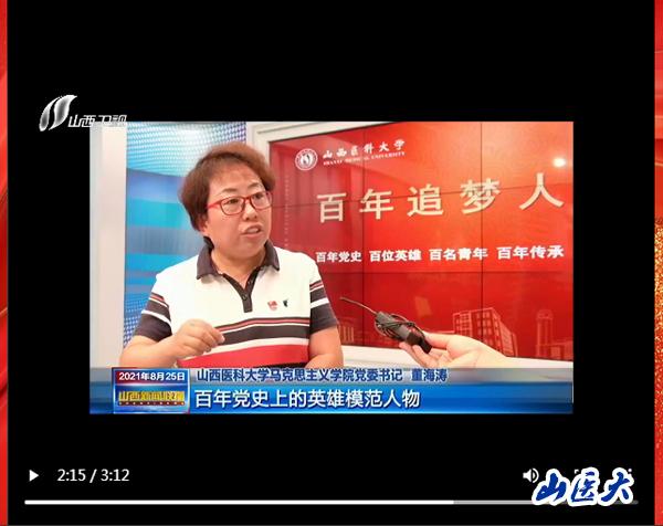 开展党史学习教育以来,我校马克思主义学院协同校团委、校党委宣传部联合录制了庆祝中国共产党成立100周年系列微视频《百年追梦人》。该视频发布以来受到社会各界广泛关注、在各类新媒体中广为传播、引起强烈反响。8月25日,《山西新闻联播》“百年奋斗路启航新征程——学党史、悟思想、办实事、开新局·先进典型”栏目以“百人百集党史微视频汇聚力量激励大学生”为题对此进行了专题报道。