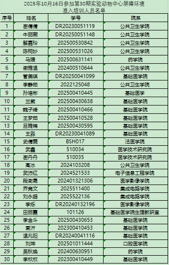 请以下参培人员于2025年10月16日下午14:30到实验动物中心三层多功能会议室参加培训和考试!