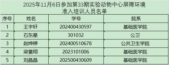 请以下参培人员于2025年10月6日下午14:30至中都校区实验动物中心三层多功能会议室参加培训和考试!