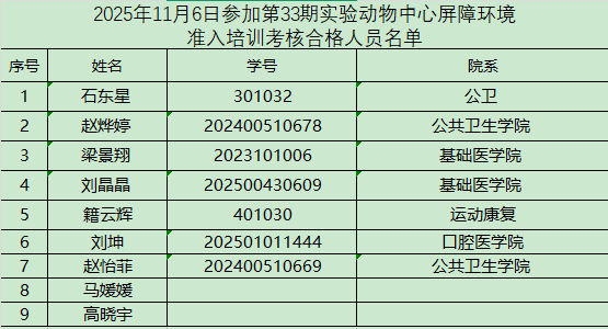 以下培训考核合格人员需在一个月内进入屏障开展动物实验,逾期须重新接受培训和考核!