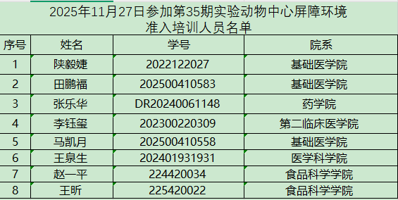 请以下参培人员于2025年11月27日下午14:30到实验动物中心三层多功能会议室参加培训和考核!