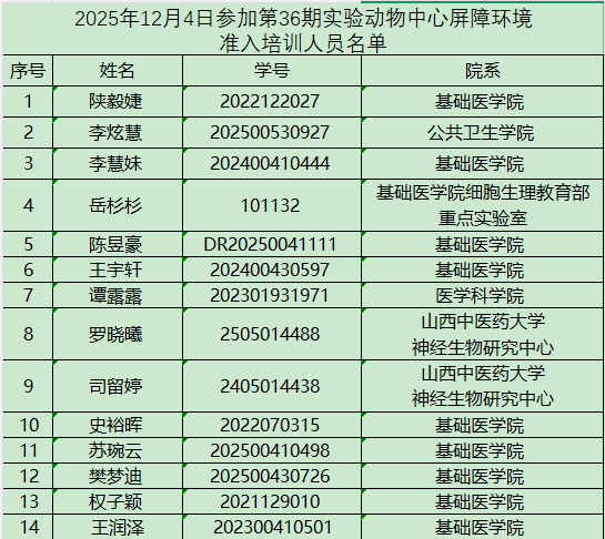 请以下参培人员于2025年12月4日下午14:30至动物中心三层多功能会议室参加培训和考试!
