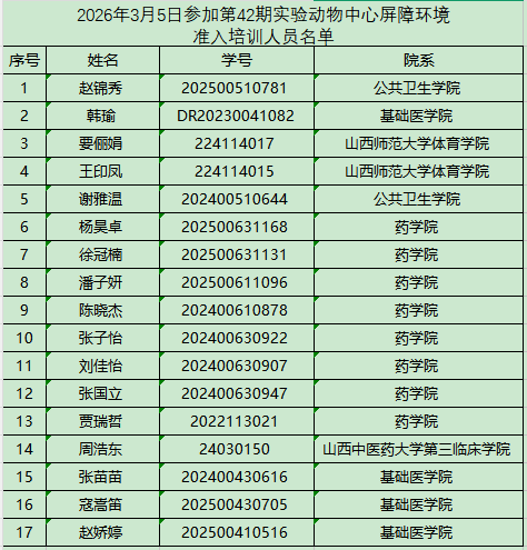 以下参培人员请于2026年3月5日下午14:30到动物中心三层多功能会议室参加培训和考试!