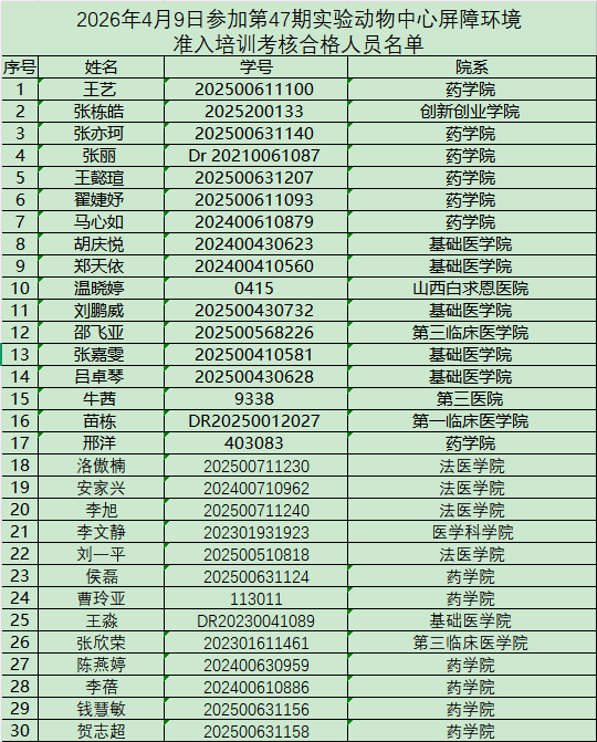 以下培训合格人员需于一个月内进入屏障开展实验,逾期未进者须重新接受培训和考核,望周知!