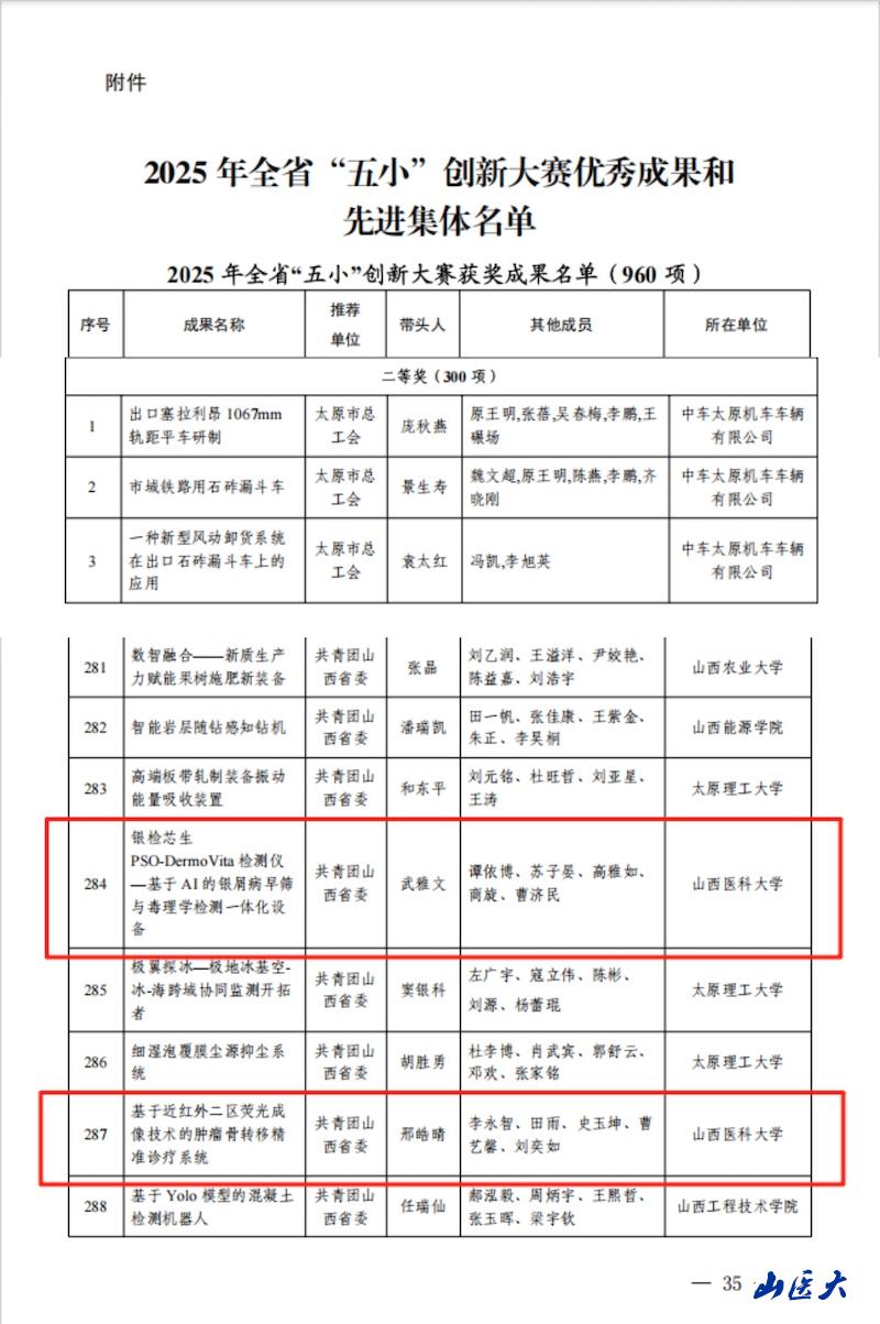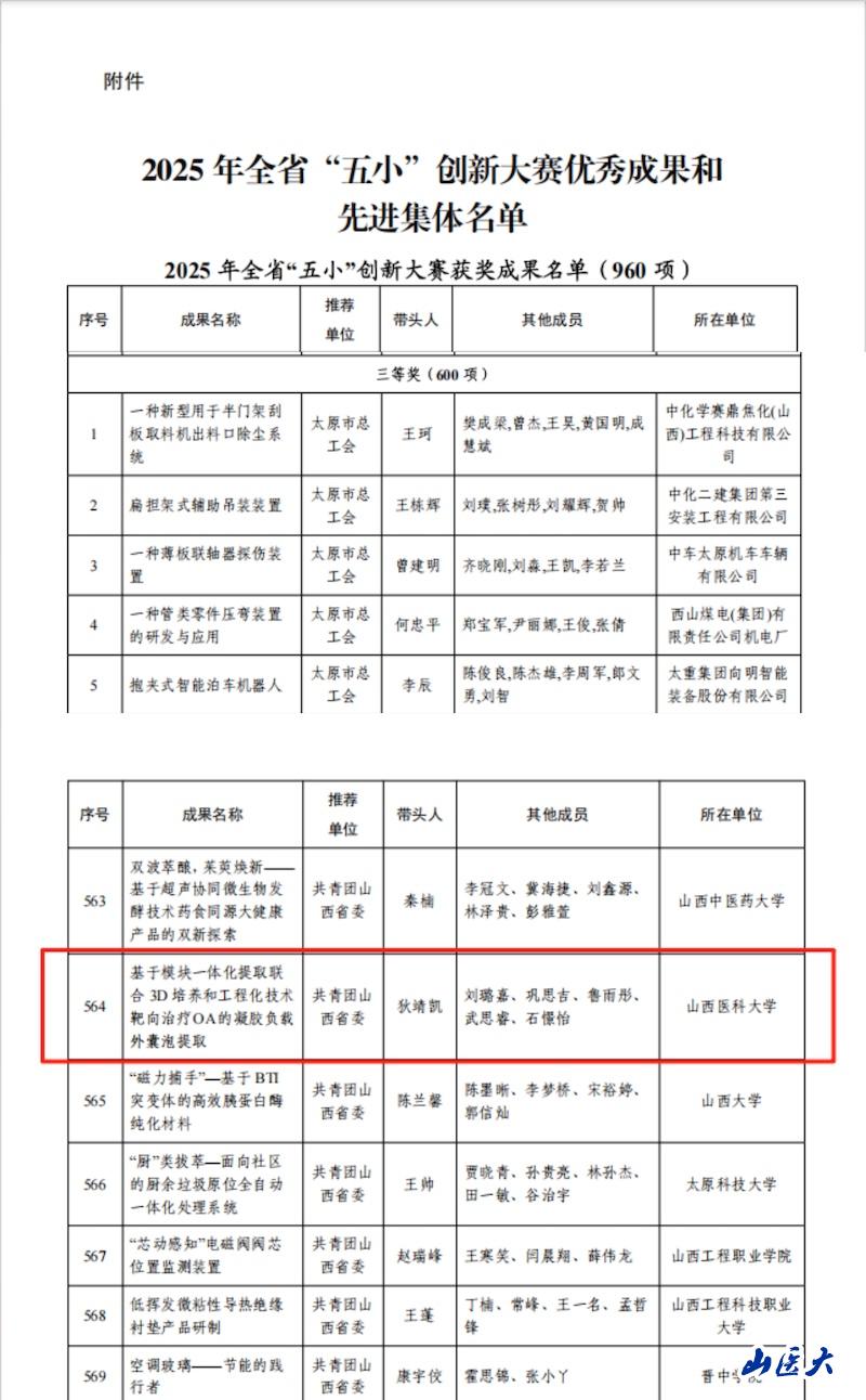近日,由山西省总工会、共青团山西省委、山西省科学技术协会组织评选的山西省2025年“五小”创新大赛评审结果公布,我校学子三项创新成果登榜获奖,充分展现了学校在生物医药、智能医疗领域的创新活力与人才培养成效。