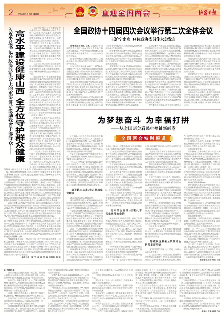 习近平总书记6日下午看望了参加全国政协十四届四次会议的农工党、九三学社、医药卫生界、社会福利和社会保障界委员,并参加联组会,听取意见和建议,发表重要讲话。出席全国两会的山西代表委员以及我省广大干部群众、各界人士第一时间深入学习领会习近平总书记重要讲话精神。大家表示,将发挥各自优势,多建务实之言,多献管用之策,在贯彻新时代卫生与健康工作方针、不断提高人民健康水平、建设高水平健康山西等方面发挥积极作用,全方位守护人民群众生命健康。