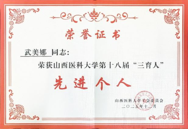 武美娜同志荣获山西医科大学第十八届“三育人”先进个人 |