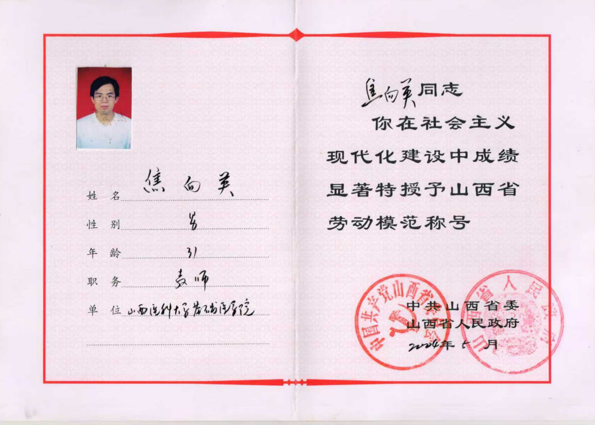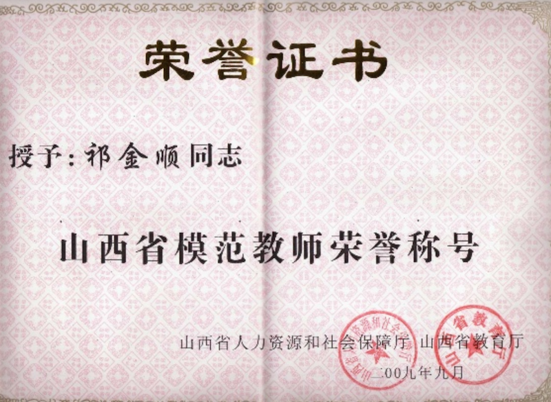 祁金顺同志荣获“山西省模范教师荣誉称号” |