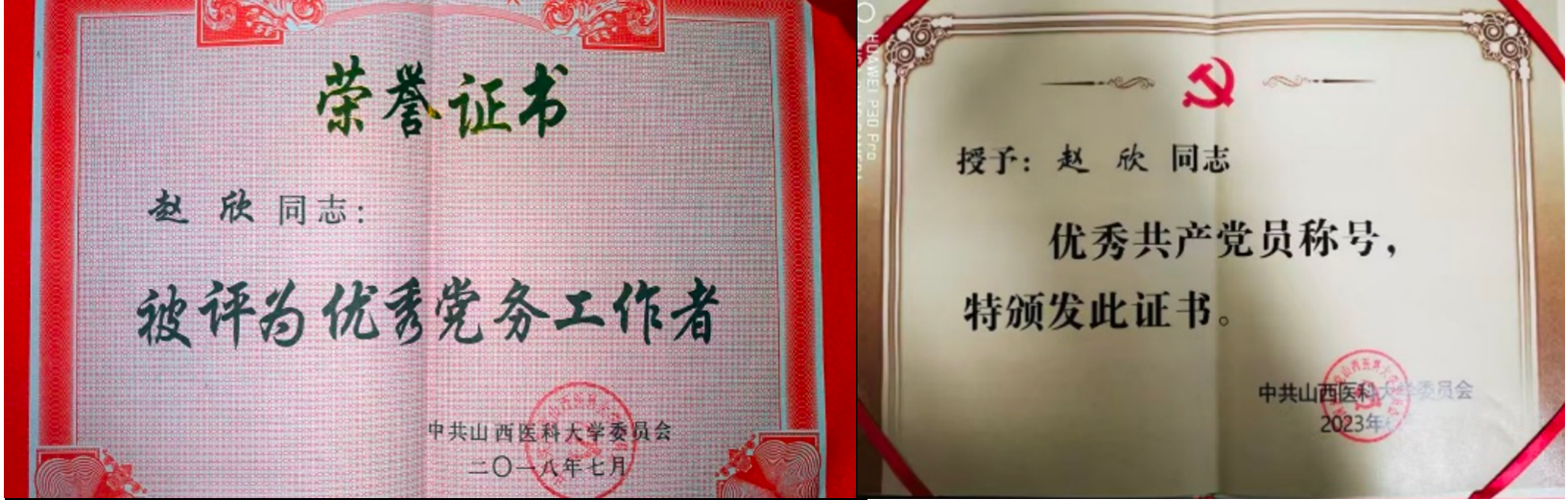 赵欣同志荣获山西医科大学“优秀党务工作者”,“优秀共产党员称号” |