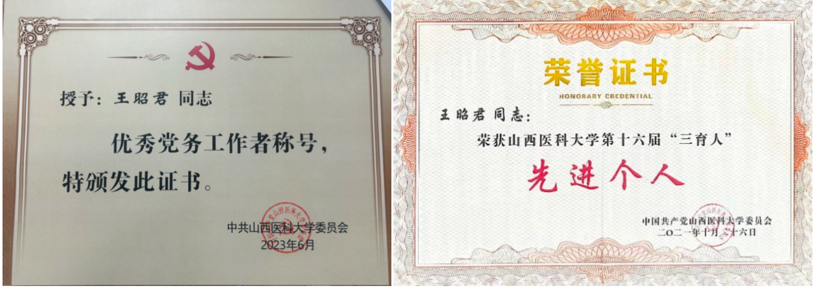 王昭君同志荣获山西医科大学“优秀党务工作者称号”,山西医科大学第十六届“三育人”先进个人 |