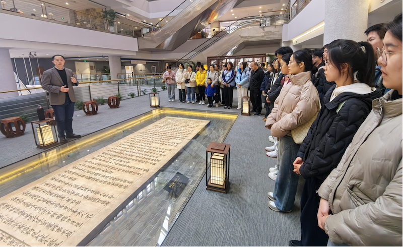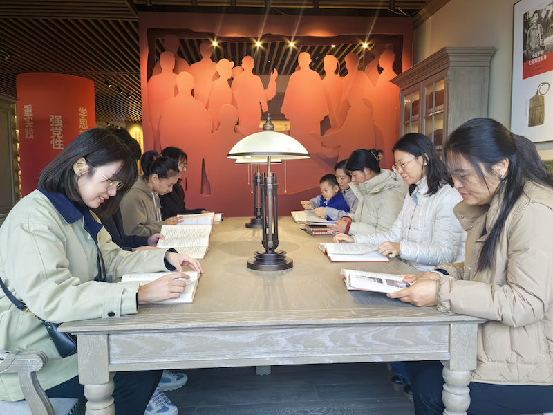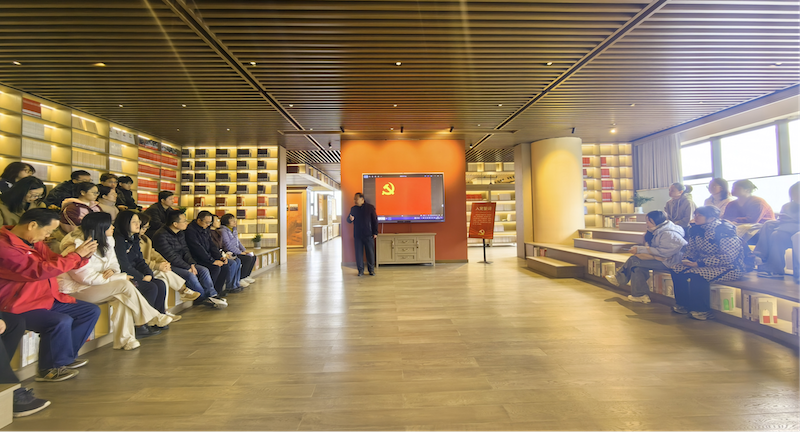 上午9:30,全体成员在图书馆门前整队合影,随后在讲解人员引导下进入“学习书房”,依次参观了“习近平新时代中国特色社会主义思想文献专架”“党的二十届三中全会专题书墙”“山西红色典籍展”等多个展区。通过文献手稿、多媒体互动屏、沉浸式朗读亭等数字化载体,党员们深入领会习近平总书记关于全面深化改革和推进中国式现代化的重要论述,切身感受到党的创新理论的思想伟力与实践温度。